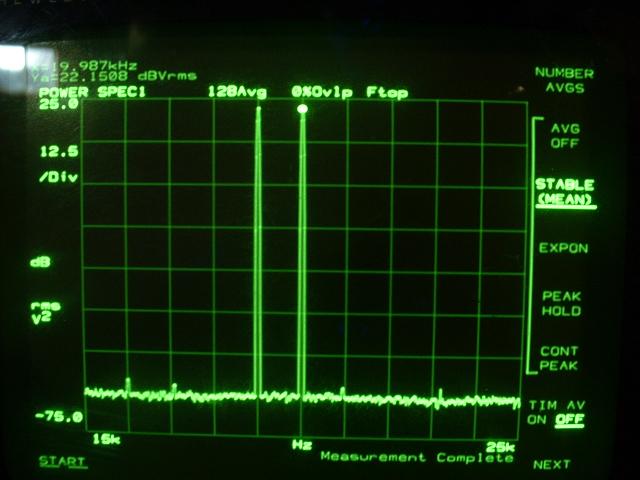 Next, we analyzed the IMD by the CCIF and SMPTE methods. For CCIF, 19KHz an 20KHz signals, originating in the PM5192 frequency synthesizer (19KHz) and the 3562A spectrum analyzer (20KHz) were mixed in 1:1 ratio. Both signal generators are 50ohm terminated, so the amplitude was chosen 2.4Vvv each to get 1.2Vvv for each component level. Unfortunately, the spectral purity of the signals is not very good, resulting in multiple artifacts. We tried to use the Amber 5500 sine wave generator for one of the components, however the output stage of the Amber 5500 was significantly distorting the other component. We also tried to use a AD797 ultra low noise/ultra low distortion opamp as a mixer. While indeed AD797 has very low noise and distortion, it’s contribution could not be neglected. Having to handle three contributions rather than two largely complicated the results processing, making an automated measurements approach almost impossible to implement. The 1:1 mixed signal (50ohm) is shown below.